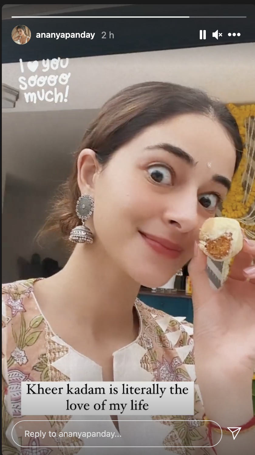 Actress Ananya Panday is embracing family time at it’s fullest. Amid Ganesh Puja celebrations, the actress took to her Instagram handle to share that she’s getting to relish her favourite sweet. Sharing a goofy selfie, the actress wrote, “Kheer Kadam is literally the love of my life”